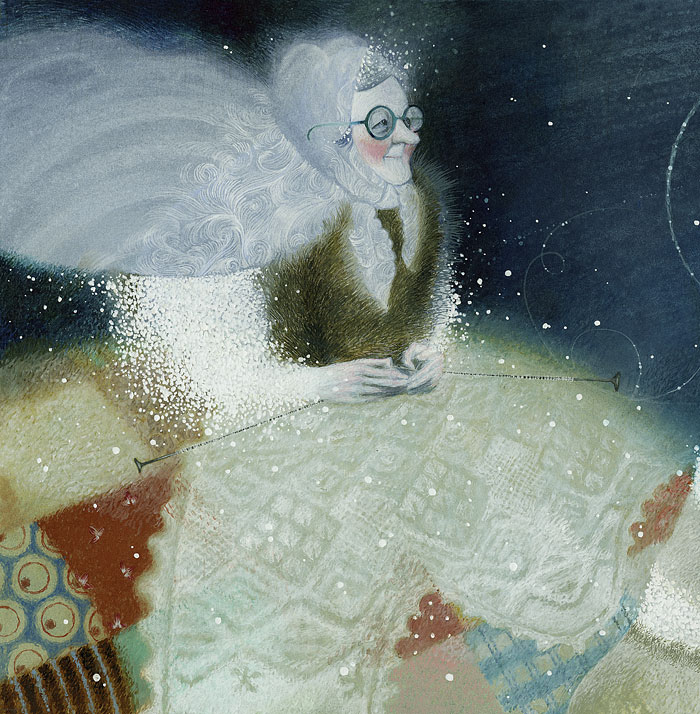 This reminded me of a song, I began to hum Gershwin’s “Rhapsody in Blue”and continued to knit, filling in the underbelly with purple and indigo yarn. I worked at the speed of magic and suddenly little Jack’s blanky was finished. With a flourish I held up the masterpiece to show D’argon. “Well what do you think?”