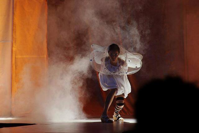 Finally the moment arrived and The Cocoon of Death was revealed behind an opaque silk curtain laden with handmade flowers. Dominique piroutted to the stage, like a butterfly in an improved version of her peach corset and shimmering tights, she had added a pair of gossamer wings and a tiny tiara of Tiffany diamonds.