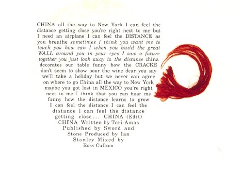 Hard Bonus: Include a lyric from Tori Amos (the listed items are all Tori Lyrics)